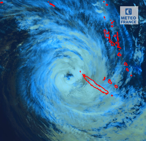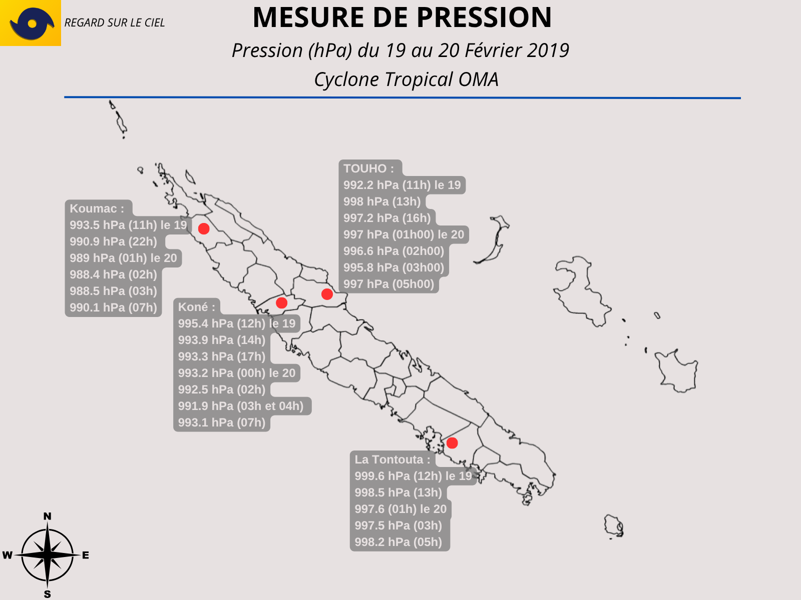 Le 19 février, le phénomène a connu son pic d’intensité : sa pression centrale a été estimée à 974 hPa, avec des vents moyens de 60 nœuds (soit environ 110 km/h) et des rafales atteignant 150 km/h à Belep.