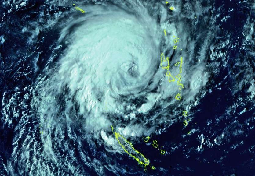 Entre le 13 et le 15 février, le système est resté quasiment stationnaire à proximité de l’île de Santo, au Vanuatu, tout en se renforçant progressivement en passant au stade de dépression tropicale forte.