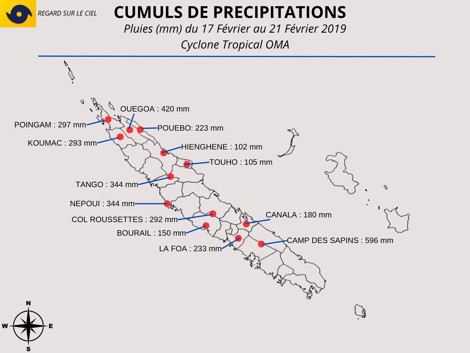 Le cyclone tropical OMA a touché la Nouvelle-Calédonie à deux reprises en février 2019. Lors de son premier passage (17–21 février), il a atteint le stade de cyclone tropical, provoquant des vents violents et des pluies intenses sur le nord du territoire.
