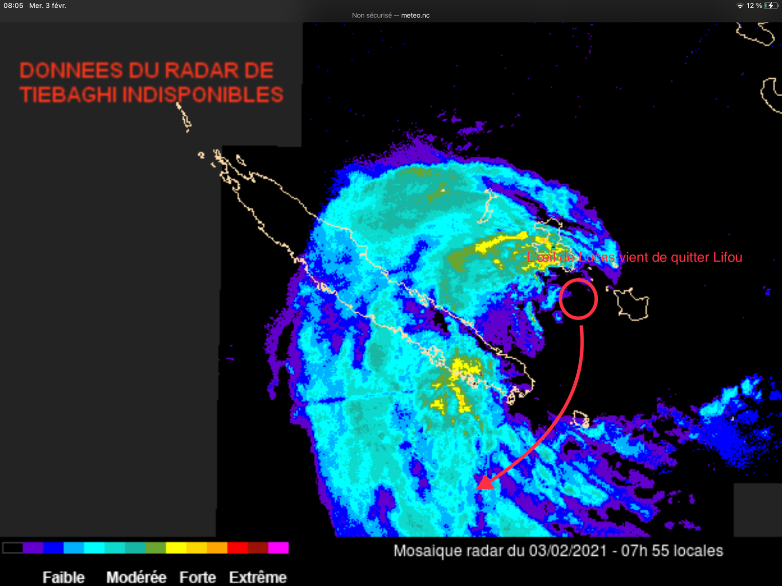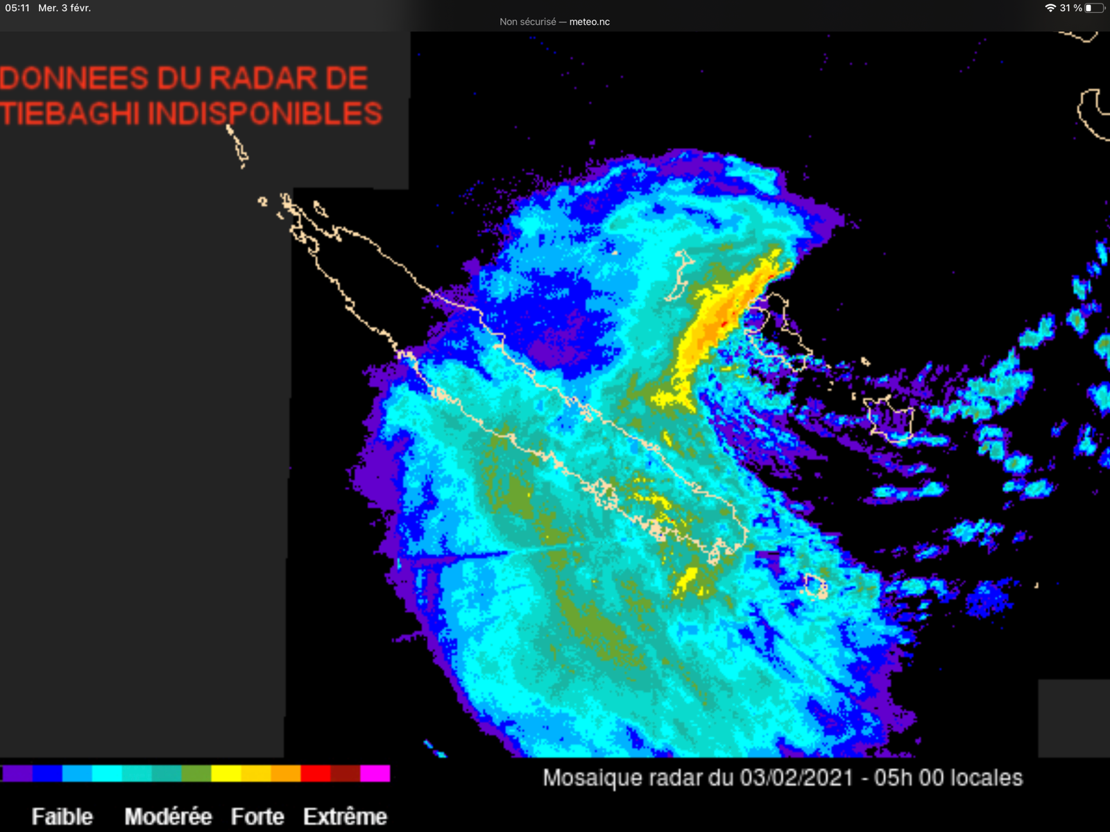 Dans la nuit du 2 au 3 février, les précipitations s’intensifient sur la Grande-Terre. Les communes du sud subissent des pluies exceptionnelles, parfois plus de 400 mm en deux jours, entraînant la montée rapide des cours d’eau et des coupures de routes. Des rafales de 100 à 130 km/h sont relevées localement, notamment à Nouméa et à l’île des Pins, accompagnées d’une mer très forte.
