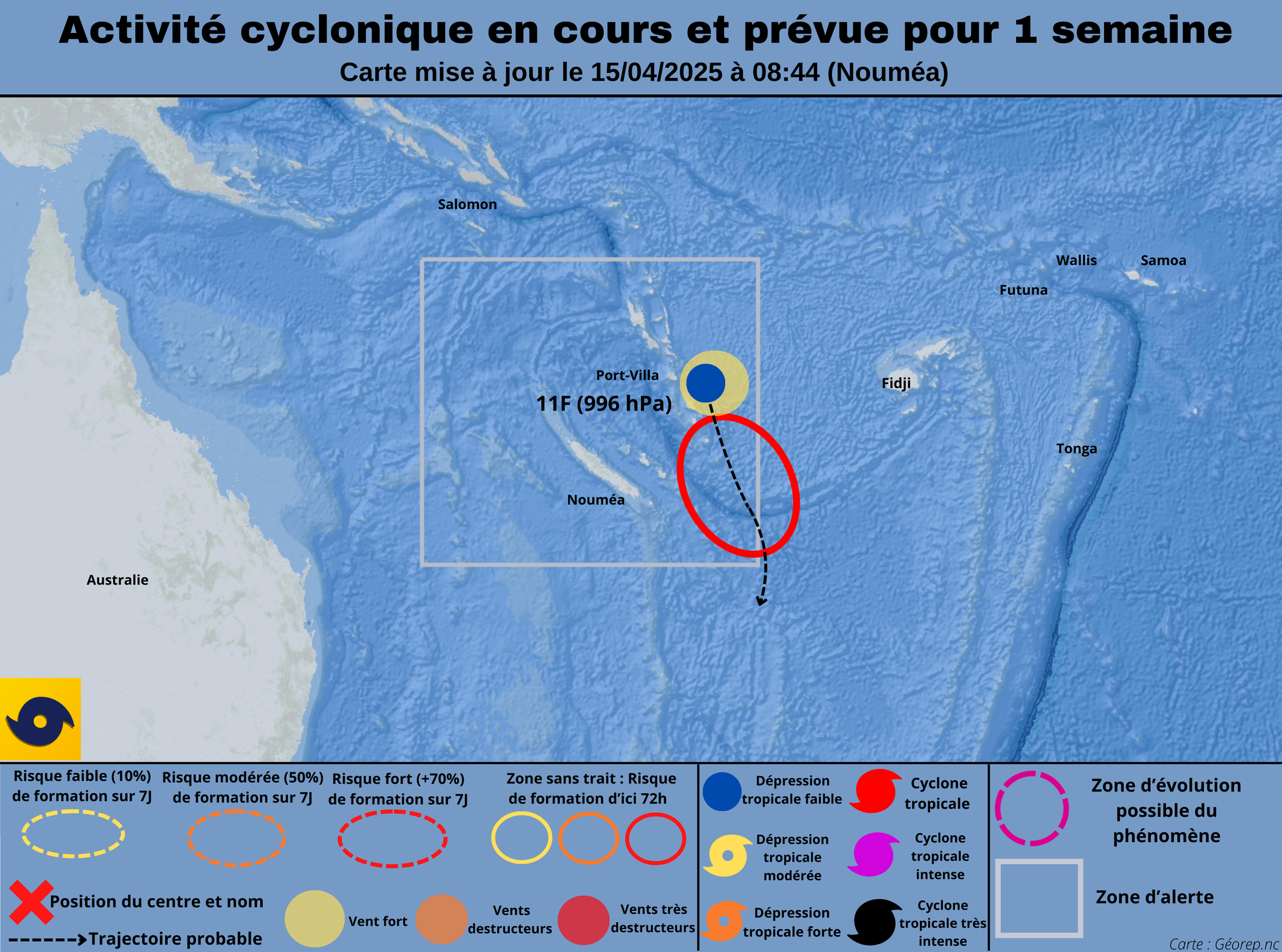 La dépression tropicale faible 11F (996 hPa) devrait atteindre le stade de dépression tropicale modérée. Le système se trouve à proximité de Port-Vila ce mardi matin et se déplace à environ 20 km/h. La province de TAFEA (Vanuatu) se trouve directement impactée. La probabilité est élevée que ce système devienne une Dépression Tropicale Modérée dans les 6 à 12 prochaines heures.
