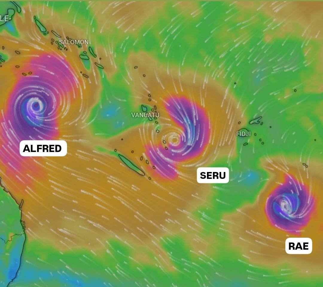 La Nouvelle-Calédonie est actuellement « cernée » par les phénomènes cycloniques, Alfred situé au nord de la mer de Corail proche d’atteindre le stade de Cyclone Tropical, Seru à l’est du Vanuatu au stade de dépression tropicale Forte et enfin RAE qui a atteint le stade de Cyclone Tropical dans la nuit de lundi à mardi (24/25 Février).