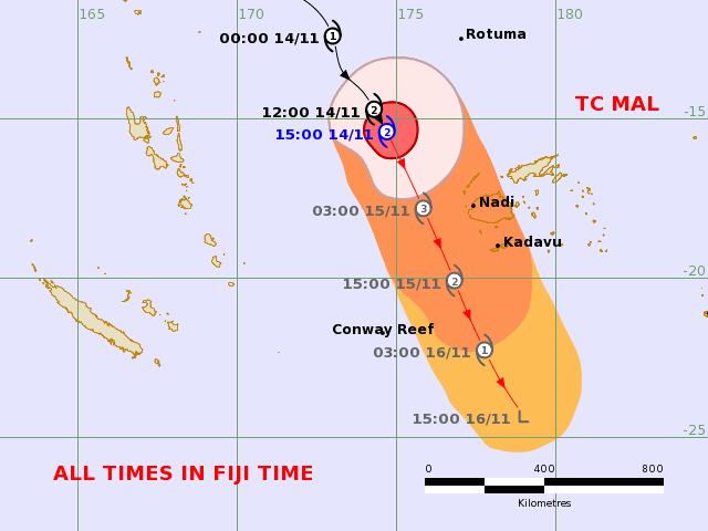 Le 2ème phénomène cyclonique de la saison à atteint le stade de dépression tropicale modérée le Lundi 13 Novmebre en début de soirée. Le mardi 14 Novembre au matin, le stade dépression tropicale forte à était atteint. La dépression porte le nom de MAL elle se rapproche des îles Fidji qu’elle va impacter dans la nuit de mardi à mercredi au plus tard mercredi 15 novembre au matin.