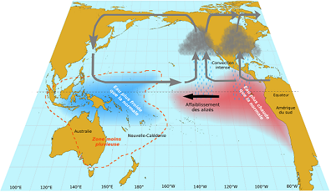 Lors d’un épisode El Niño, les hautes pressions du Pacifique sud diminuent. Ainsi, lors des situations El Niño, des conditions sèches se développent sur l’Indonésie et sur l’Australie, les dépressions tropicales et les cyclones apparaissent plus à l’est qu’à l’habitude et peuvent même affecter la Polynésie française. Mais quelle que soit la phase d’ENSO (El Niño, La Niña ou neutre), il ne faut pas oublier que la Nouvelle-Calédonie se trouve dans une zone du Pacifique très exposée à l’aléa cyclonique.