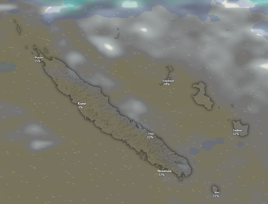 Couverture nuageuse prévue le mardi 3 mars à 22 heures sur la Nouvelle-Calédonie, d’après le modèle météo Européen (via windy).