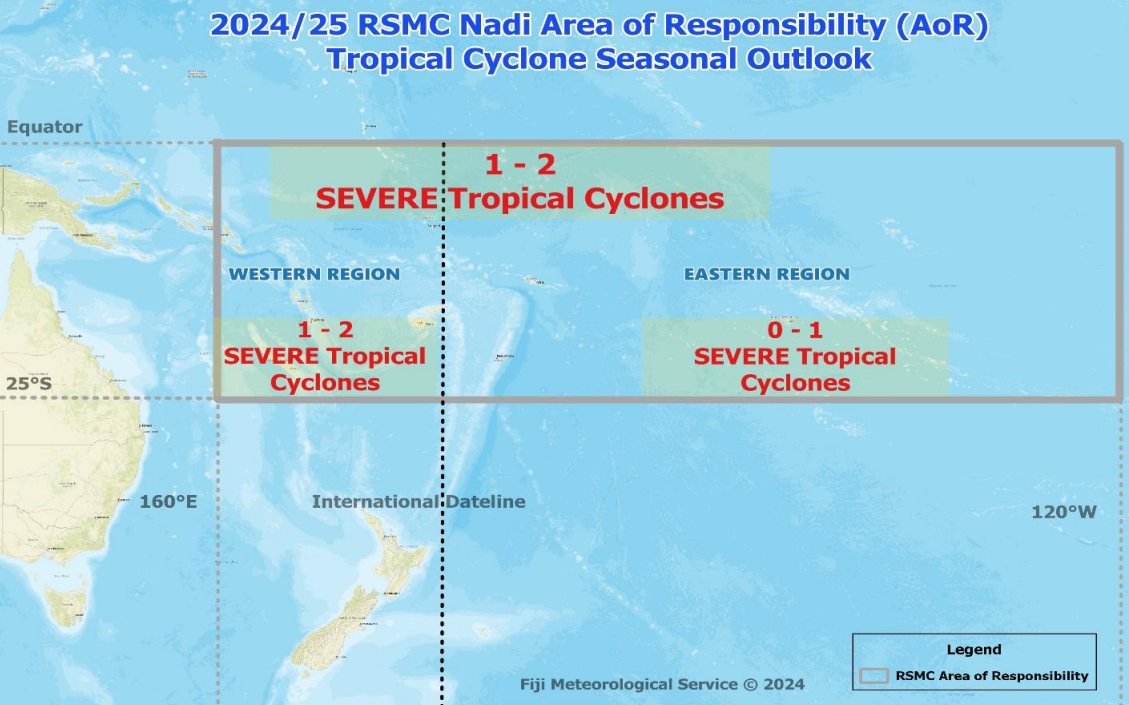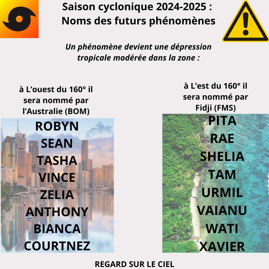 6 à 10 phénomènes nommés pourraient se produire dans le Pacifique Sud-Ouest de novembre 2024 à avril 2025 au moins. Le risque d’évolution d’un phénomène tropical devrait être plus élevé près de la mer de Corail et des îles Salomon soit assez proche de la Nouvelle-Calédonie, selon les prévisions Néo-Zélandaise. Le service météo de Fidji évoque lui 5 à 6 phénomènes nommés dans leur zone de responsabilité (la Mer de Corail n’est pas prise en compte). Le BOM, service météo Australien évoque, 10 phénomènes nommés sur l’ensemble de notre bassin. Cela nous fait donc une saison globalement bien dans les normes.