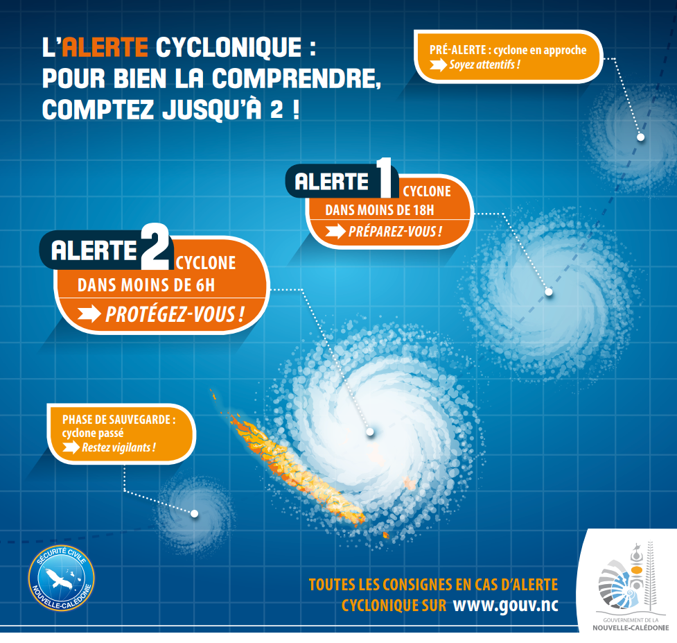 Les cyclones représentent un danger météorologique majeur pour la Nouvelle-Calédonie, en particulier pendant la saison cyclonique de novembre à avril. Face à un tel risque, le gouvernement de la Nouvelle-Calédonie a mis en place une procédure d’alerte cyclonique. Dès qu’une dépression tropicale au stade de dépression tropicale forte pénètre ou se forme dans la zone d’avertissement, Météo France Nouvelle-Calédonie avertit la DSCGR. En fonction de la menace, le président du gouvernement prend la décision, après avis du conseil de direction, d’activer le dispositif ORSEC en matière de risque cyclonique, qui comprend plusieurs niveaux d’alerte : La Pré-Alerte, Alerte 1 et l’Alerte 2. Voici ci-dessous comment se préparer à l’arrivée d’un cyclone :
