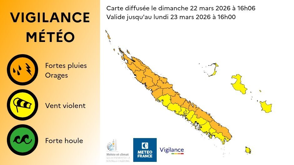 Carte de vigilance de météo France Nouvelle-Calédonie émise le 22/03/2026 à 16 heure locale