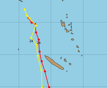 Les dernières prévisions semblent se maintenir, c’est-à-dire qu’elle devrait se déplacer vers le sud, avec un passage proche de Bélep dans la nuit de lundi à mardi. Sa position prévue lundi à 17 h est à environ 150 km au nord-ouest de Bélep selon Météo France. Elle devrait ensuite s’évacuer dans la journée de mardi vers le sud-sud-est en se renforçant. Elle entraîne avec elle une forte zone pluvio-orageuse et un renforcement du vent de secteur Nord à Nord-Est, notamment sur le Nord. Selon Météo-France Nouvelle-Calédonie, la situation reste plus incertaine sur le Sud, où des précipitations sont déjà mesurées, avec 92 mm à Yaté depuis le début de la journée.