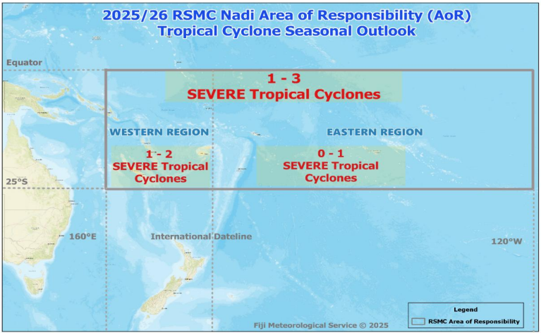 La plupart des prévisions des différents services météo sont globalement en accord pour une activité cyclonique plus élevée en Mer de Corail, donc proche de la Nouvelle-Calédonie et du Vanuatu. Toutefois, cela n’empêche pas un impact sur les autres régions du Pacifique. Il est donc important de suivre l’évolution de la situation météorologique et d’être préparé en cas de menace. Attention, même sans cyclone tropical, les fortes pluies peuvent provoquer inondations et crues soudaines, comme on l’a vu avec la dépression tropicale forte Lucas en 2021. La submersion marine en cas de dépression ou de cyclones peut provoquer de graves dégâts. Des phénomènes peuvent se produire hors saison cyclonique (ex : DONNA en mai 2017), la saison débute officiellement le 1er novembre 2025 jusqu’au 30 avril 2026.